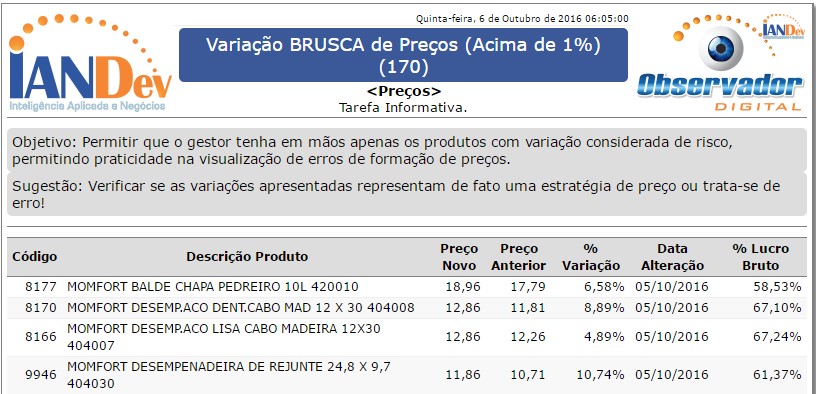 Quando ocorrer uma alteração de preços superior a X% (Configurado), o Observador Digital fará uma listagem desses produtos e enviará para o responsável analisar e nos casos que julgar pertinente, tomar alguma ação de encaminhamento, corrigindo o produto ou dando aceite.