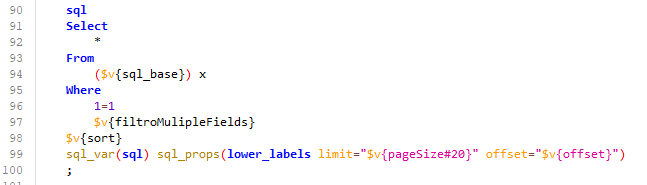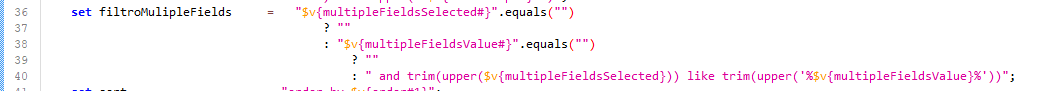 set filtroMulipleFields = "$v{multipleFieldsSelected#}".equals("") ? "" : "$v{multipleFieldsValue#}".equals("") ? "" : " and trim(upper($v{multipleFieldsSelected})) like trim(upper('$v{multipleFieldsValue}'))";************** SCRIPT FUNCTION - SQL **************